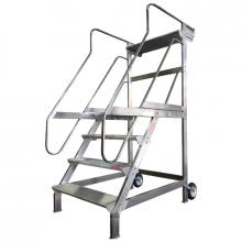 CASFOR scala con ruote, piattaforma, parapetto e corrimano con protezione posteriore.