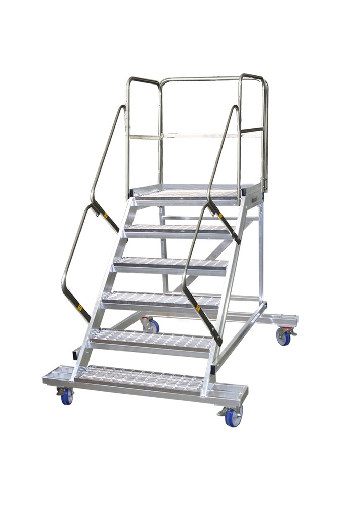 Pedana da 60 x 60 cm. Altezza al piano 100 cm. Scale professionali per l’accesso e la manutenzione su automezzi. 4 ruote 150 mm