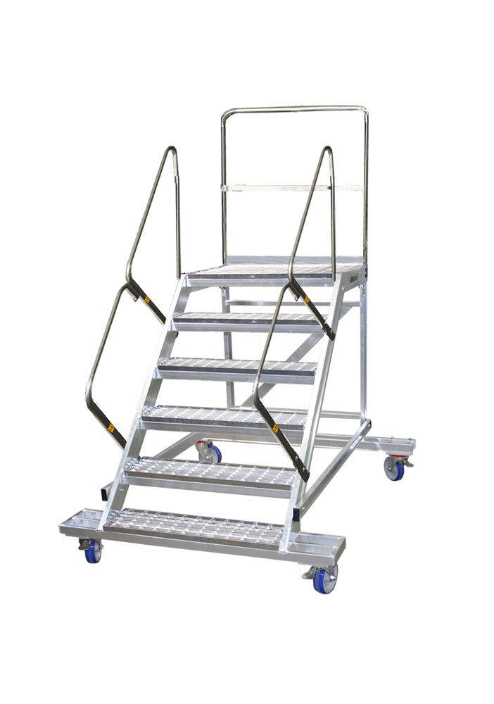 Pedana da 60 x 60 cm. Altezza al piano 100 cm. Scale professionali per l’accesso e la manutenzione su automezzi. 4 ruote 150 mm