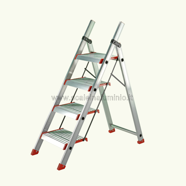 Ampia pedana in alluminio estruso (370x240) con zigrinatura antiscivolo. I montanti anch'essi in alluminio estruso con sezione da (55x25) sono fissati tra loro con un tubo da 27x27 ribattuto e la vaschetta in PVC consente l'appoggio di vari oggetti.