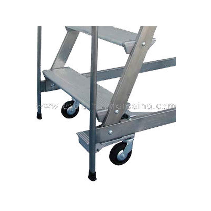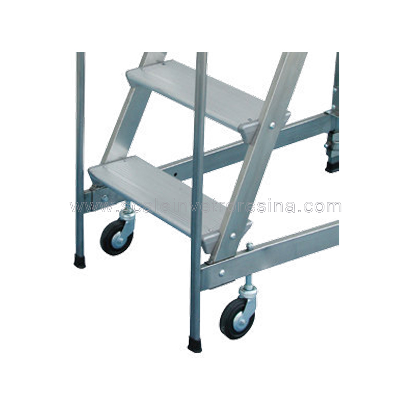 – (A) Con 2 ruote fisse posteriori e 2 ruote piroettanti anteriori con molla. Quando l’operatore sale sulla scala il peso dello stesso provoca uno schiacciamento delle molle anteriori e la scala a questo punto non si regge più sulle ruote ma sui piedini anteriori bloccandosi a terra.