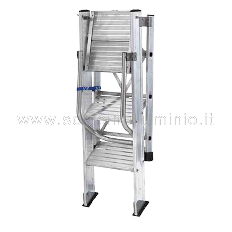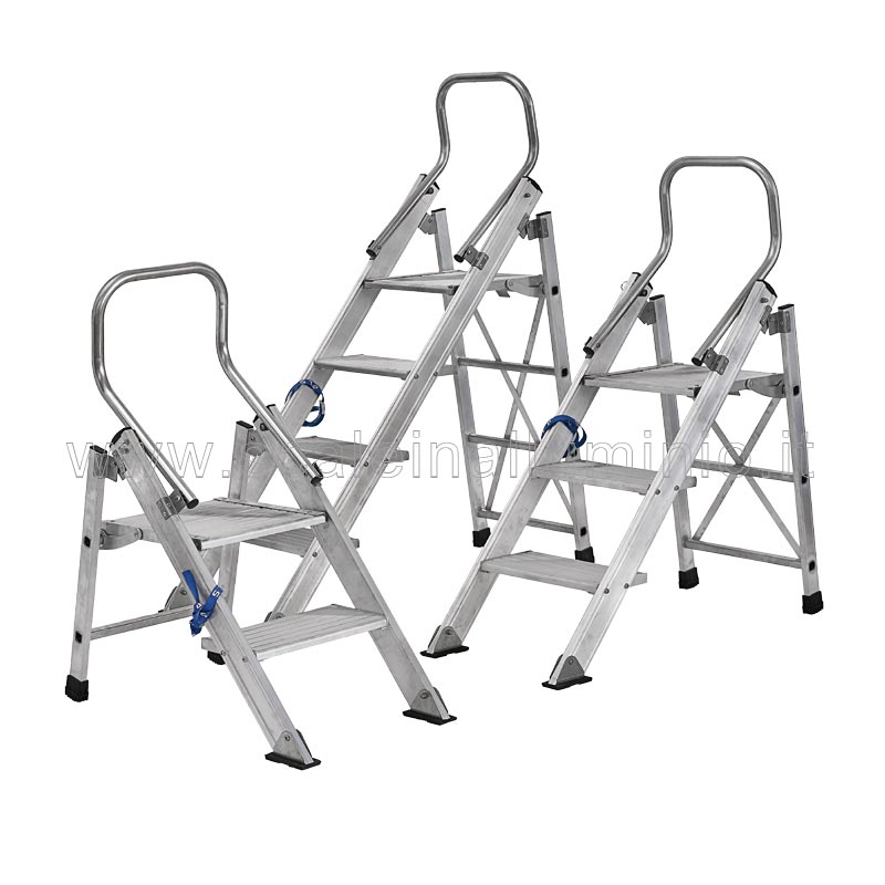 Comodissimo sgabello pieghevole con una struttura completamente realizzata in alluminio, dotato di ampli gradini antiscivolo da mm 200 ciascuno e pedana da 400 mm.
