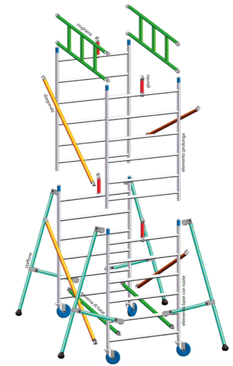 Ponteggio di facile e rapido montaggio grazie alla leggerezza del materiale utilizzato e agli agganci automatici che non richiedono l’uso di utensili; massima stabilità in ogni configurazione.