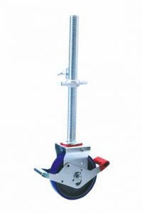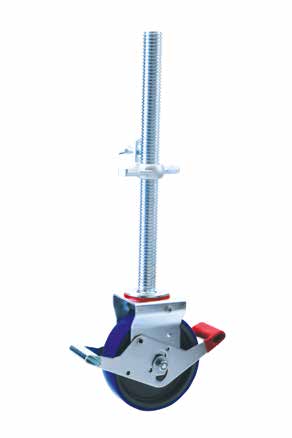 Ruote Ø mm 200 rivestite in poliuretano dotate di regolazione stabilizzante fino a mm 200 e dispositivo frenante a doppio pedale con portata kg 400 cadauna