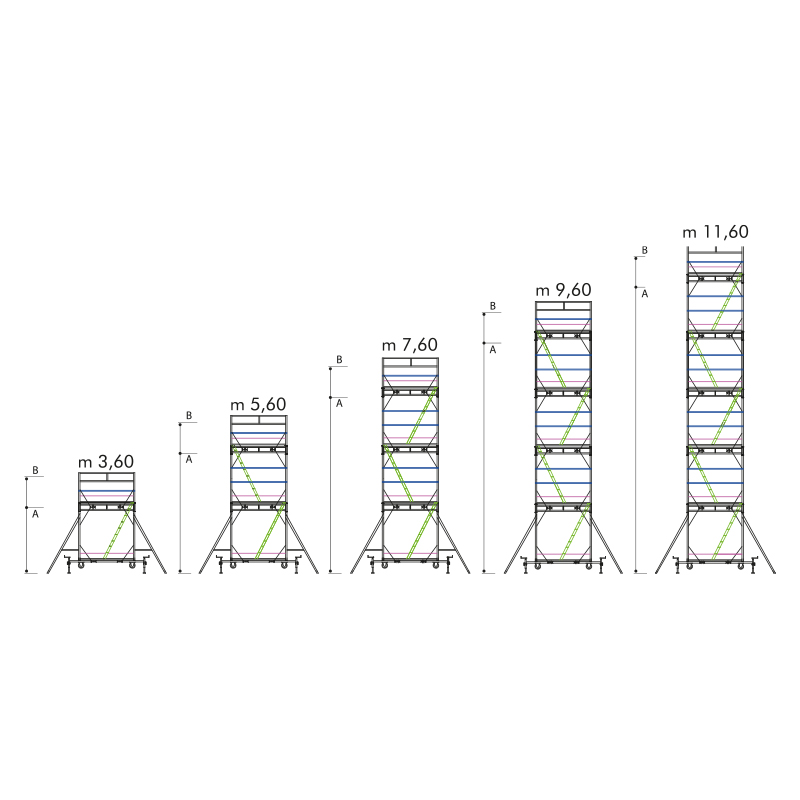| Altezza totale B(m) | 3,6 | 5,6 | 7,6 | 9,6 | 11,6 | 13,6 | ||