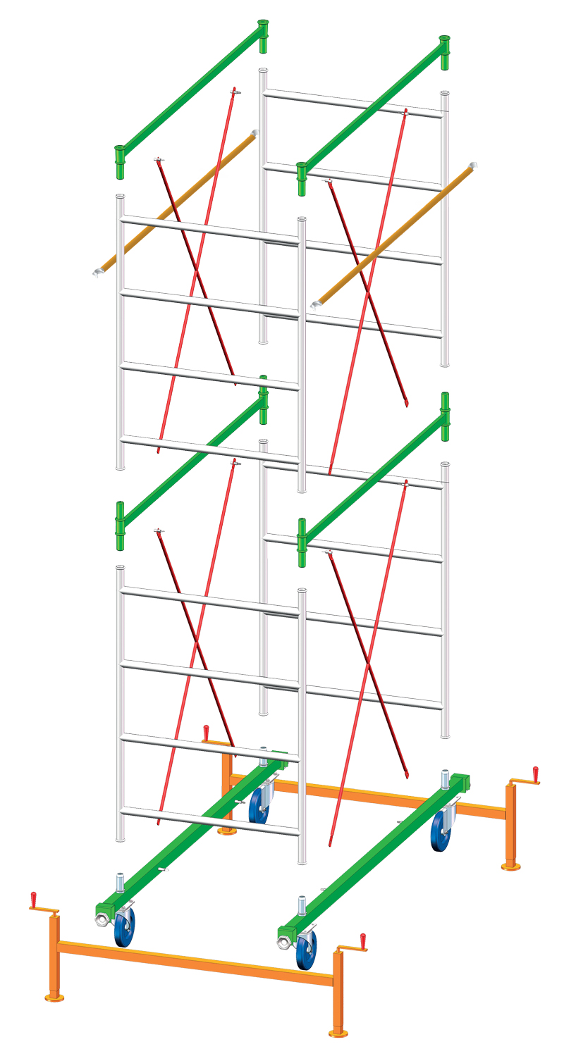 Caratteristiche:Montanti in tubo tondo d’acciaio Ø mm 42Ruote Ø mm 150 rivestite in poliuretano con dispositivo frenante a doppio pedaleDimensioni base (compresi gli stabilizzatori) mm 2310x1540Altezza base mm 230Altezza campata mm 1477Piano di lavoro da mm 1740×900 con sistema antivento suddiviso in due parti una fissa mm 1620x 355 e una con botola mm 1620x 525Portata (comprese N. 2 persone) kg 200Costruito in conformità al D.lgs.81/2008 art. 140 con obbligo di ancoraggio.